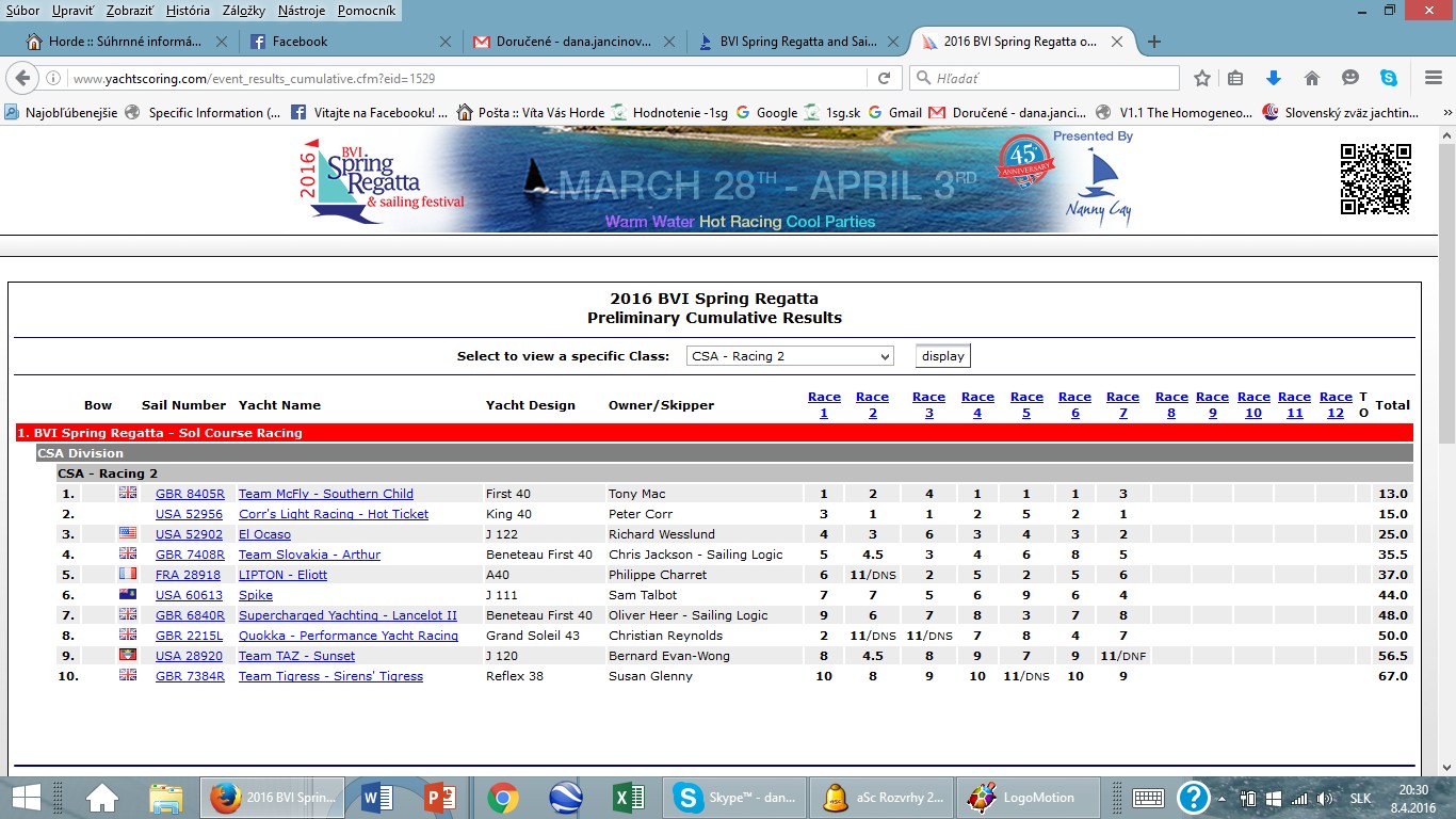 Miesto a dátum : Nanny Cay Tortola (IVB), 01.04.2016 - 03.04.2016