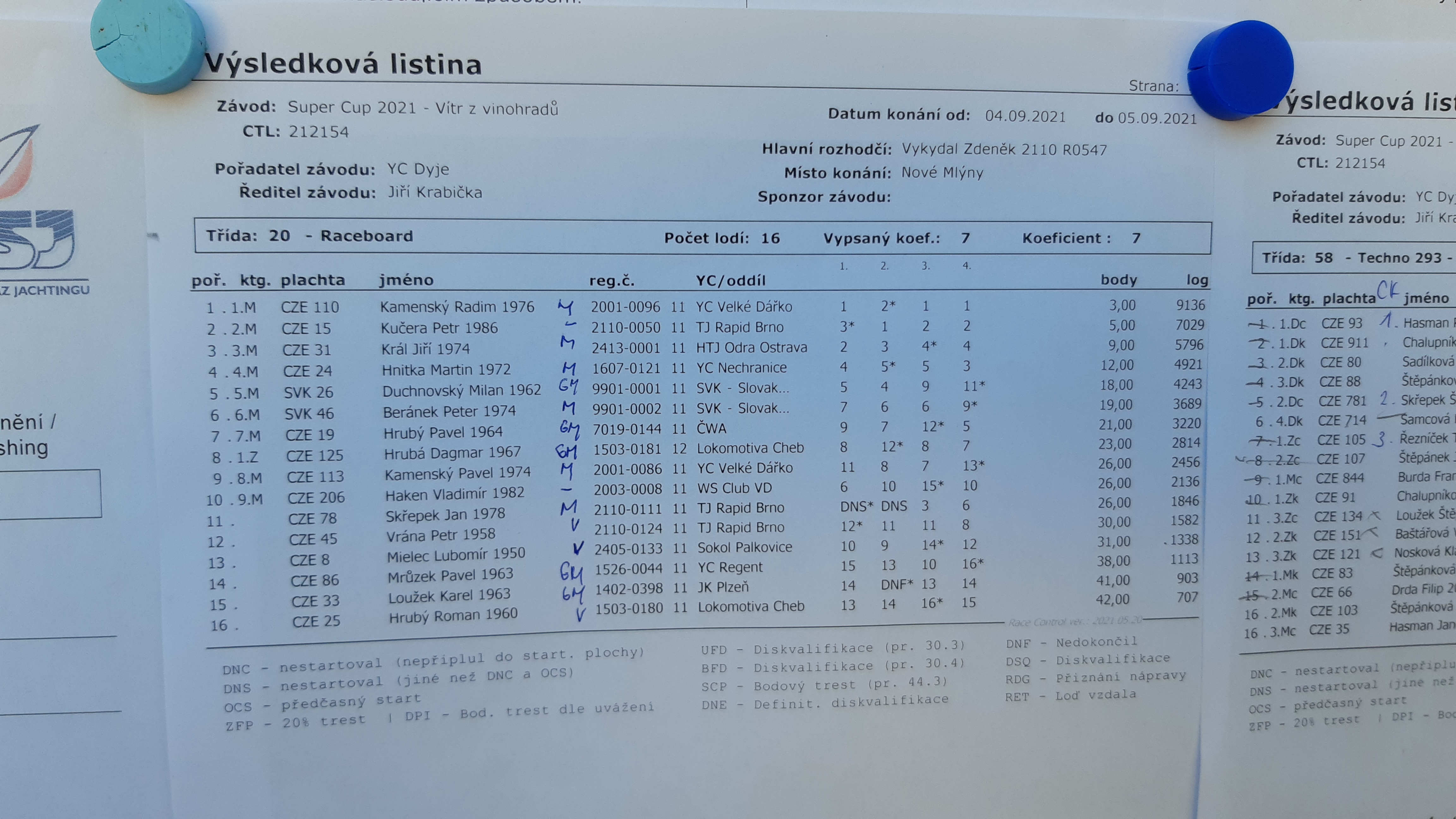 Výsledková listina pretekov v jachtingu
