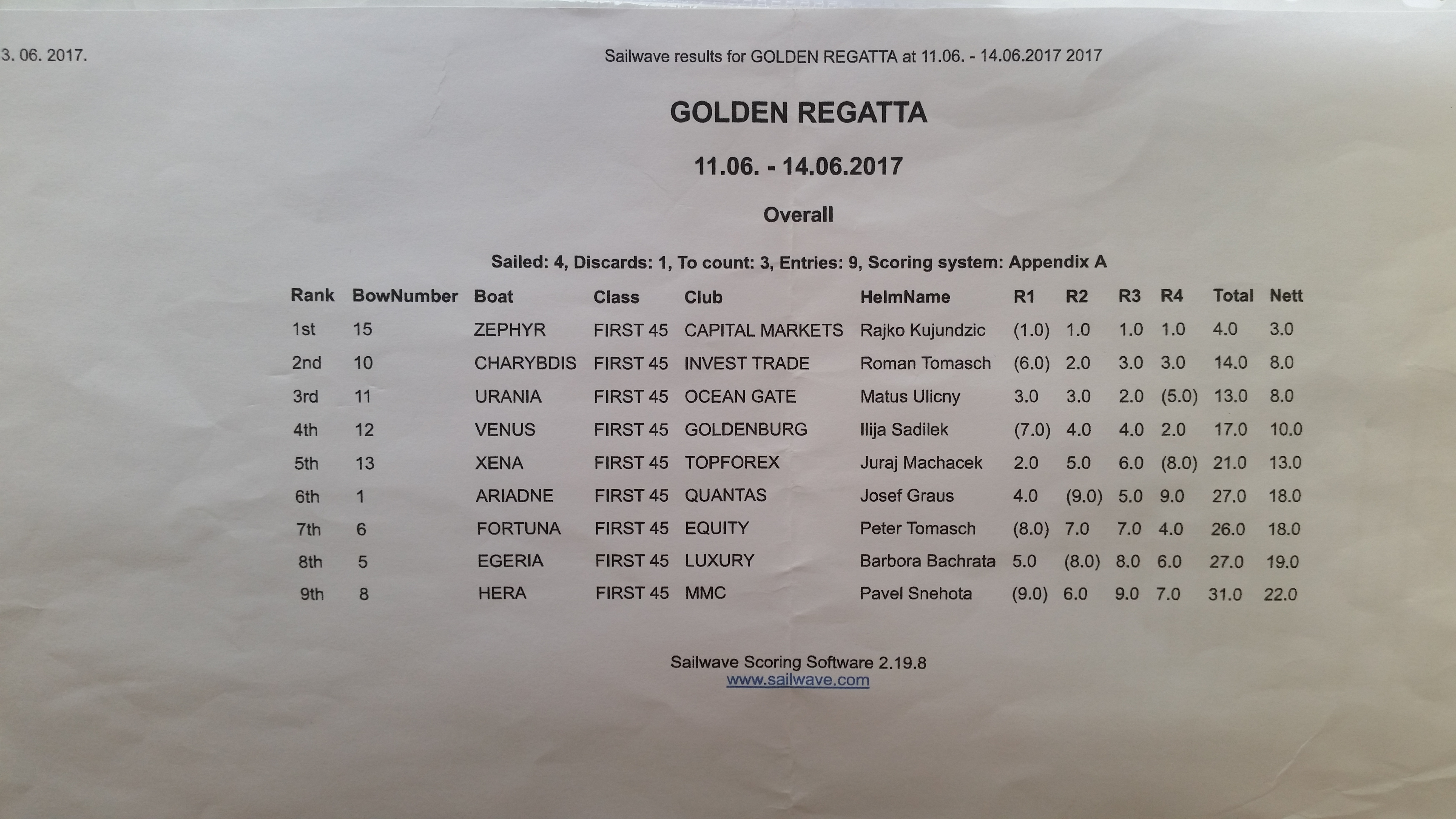 Výsledková listina pretekov v jachtingu